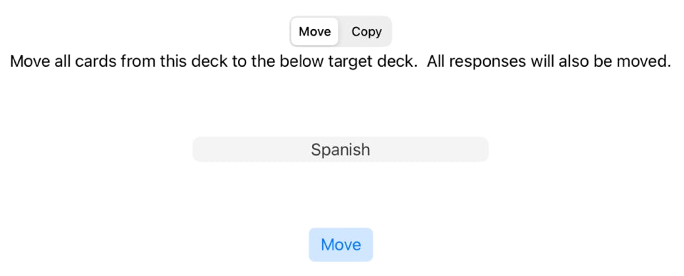 Tap the Move/Copy button at the bottom of the Cards screen to move or copy all cards from one deck to another deck:
