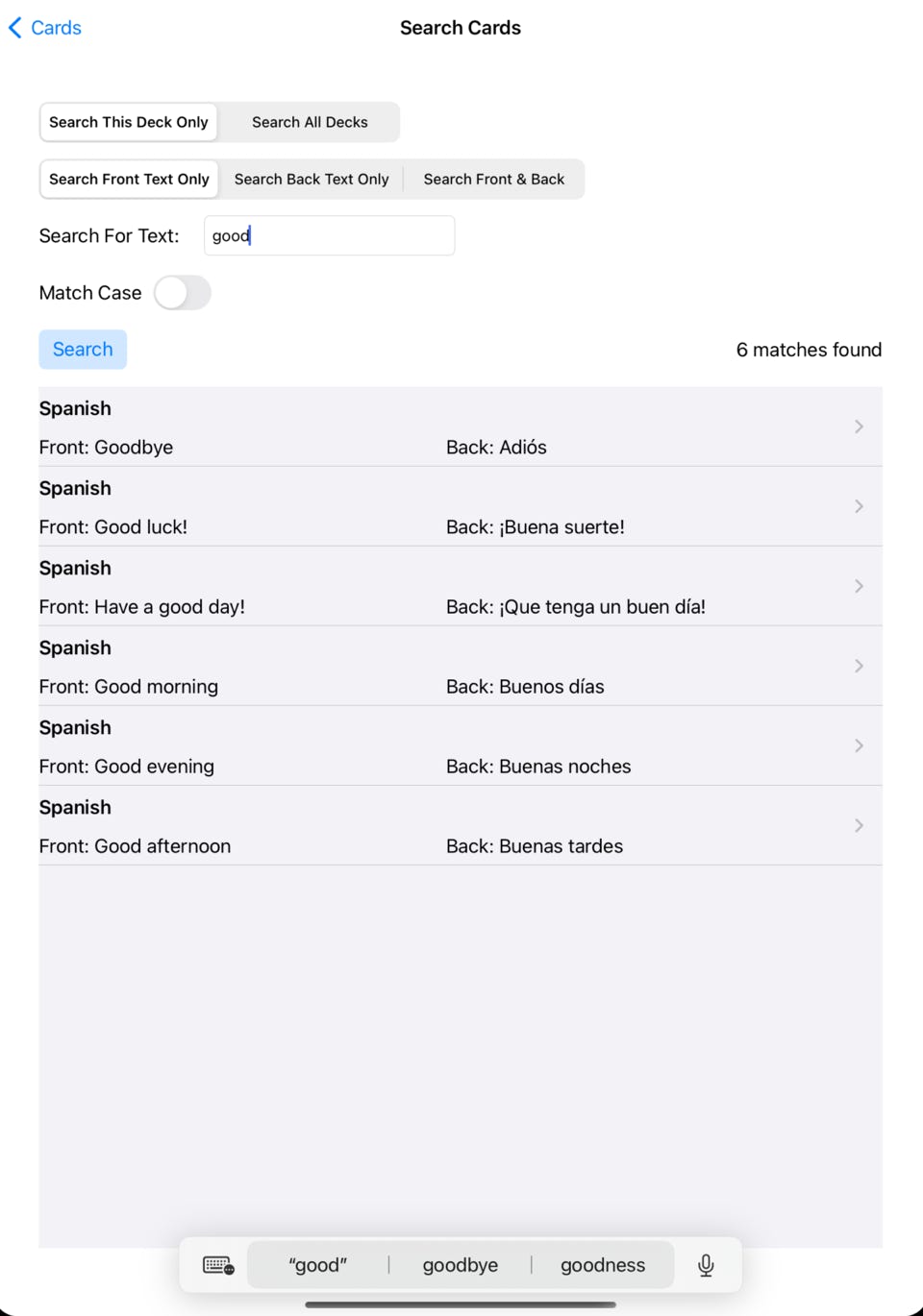 The Search Cards option can be used to find cards where the front text and/or back text matches the search text. You can search within the current deck, or across all decks.
