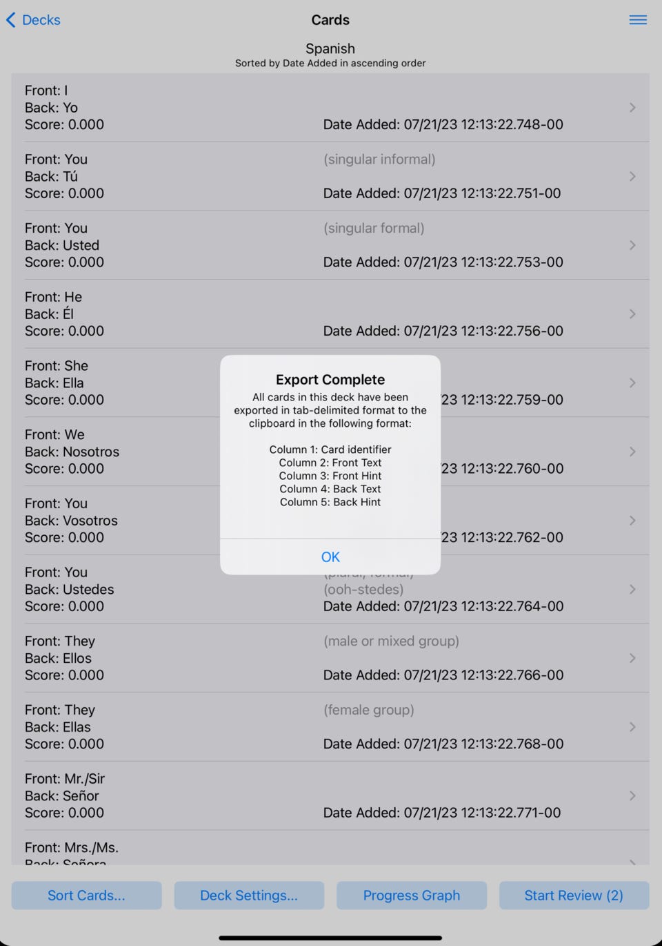 The Export option immediately copies all cards in the current deck to the clipboard. Only the following five columns are copied: