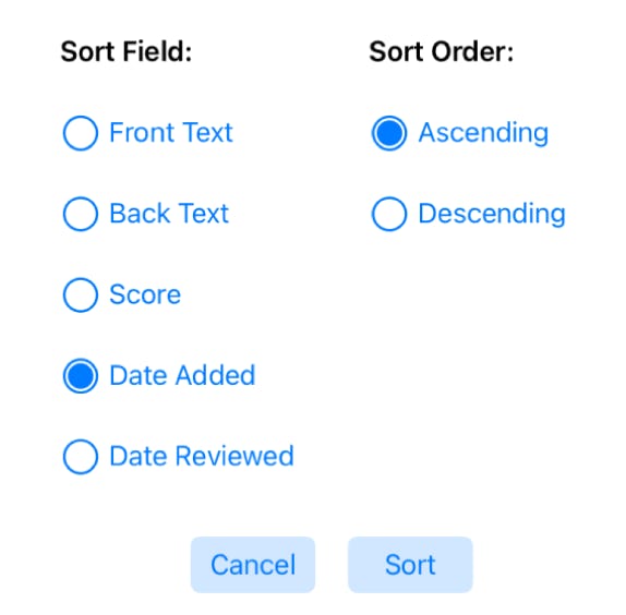Tap the sort button at the bottom of the Cards screen to display sort options.