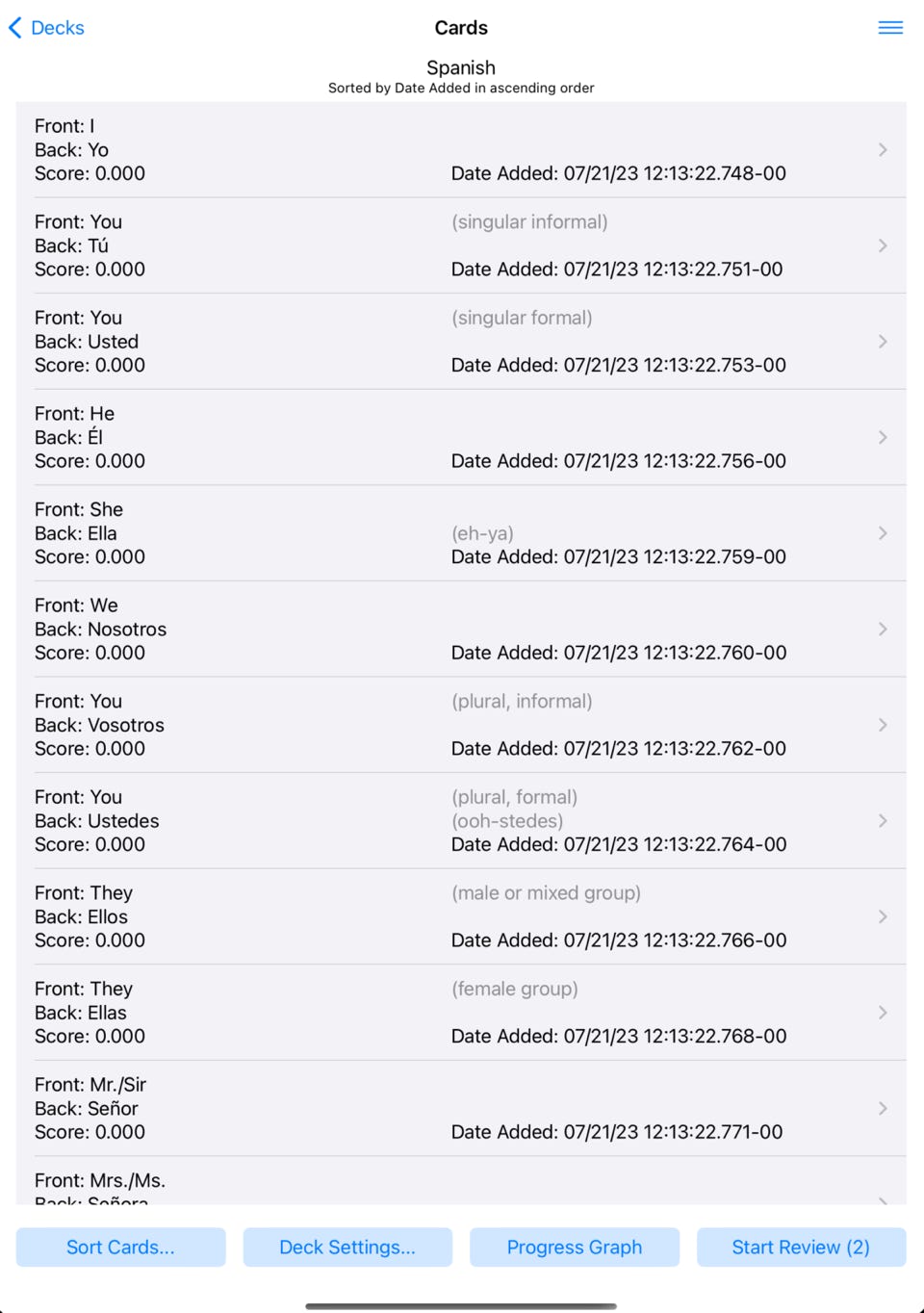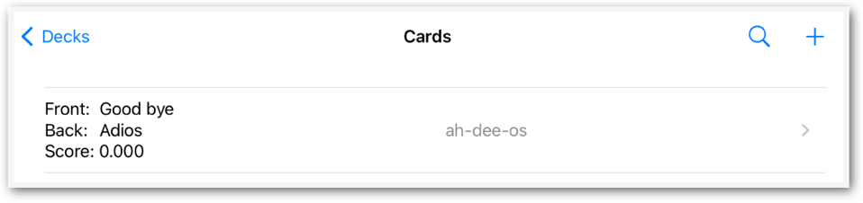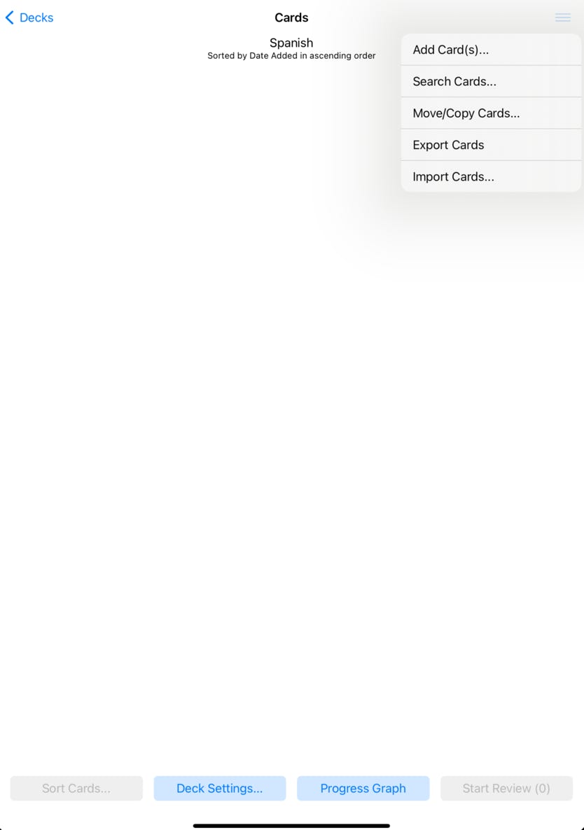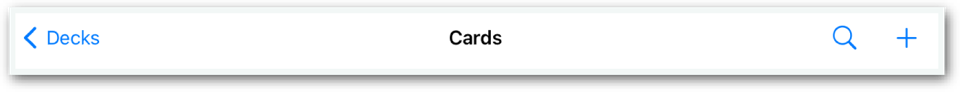 Tap on a deck in the “Decks” screen to display the Cards screen. This screen will initially be empty after creating a deck.