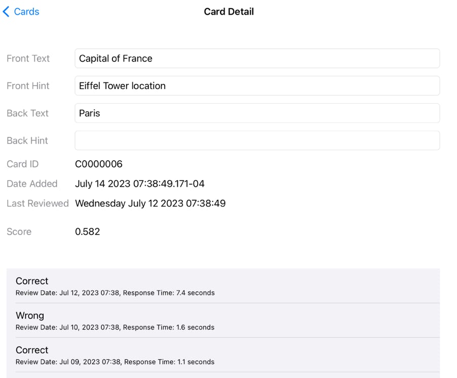 Click on a card in the Cards screen to display detailed information on that card. The lower half of the screen (in gray) shows a history of the responses (if any) from previous review sessions.