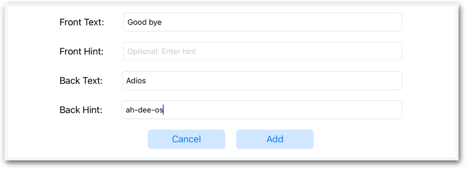 A screen appears where you can enter the text and hints, as shown here. The front and back text fields are required, both hint fields are optional.