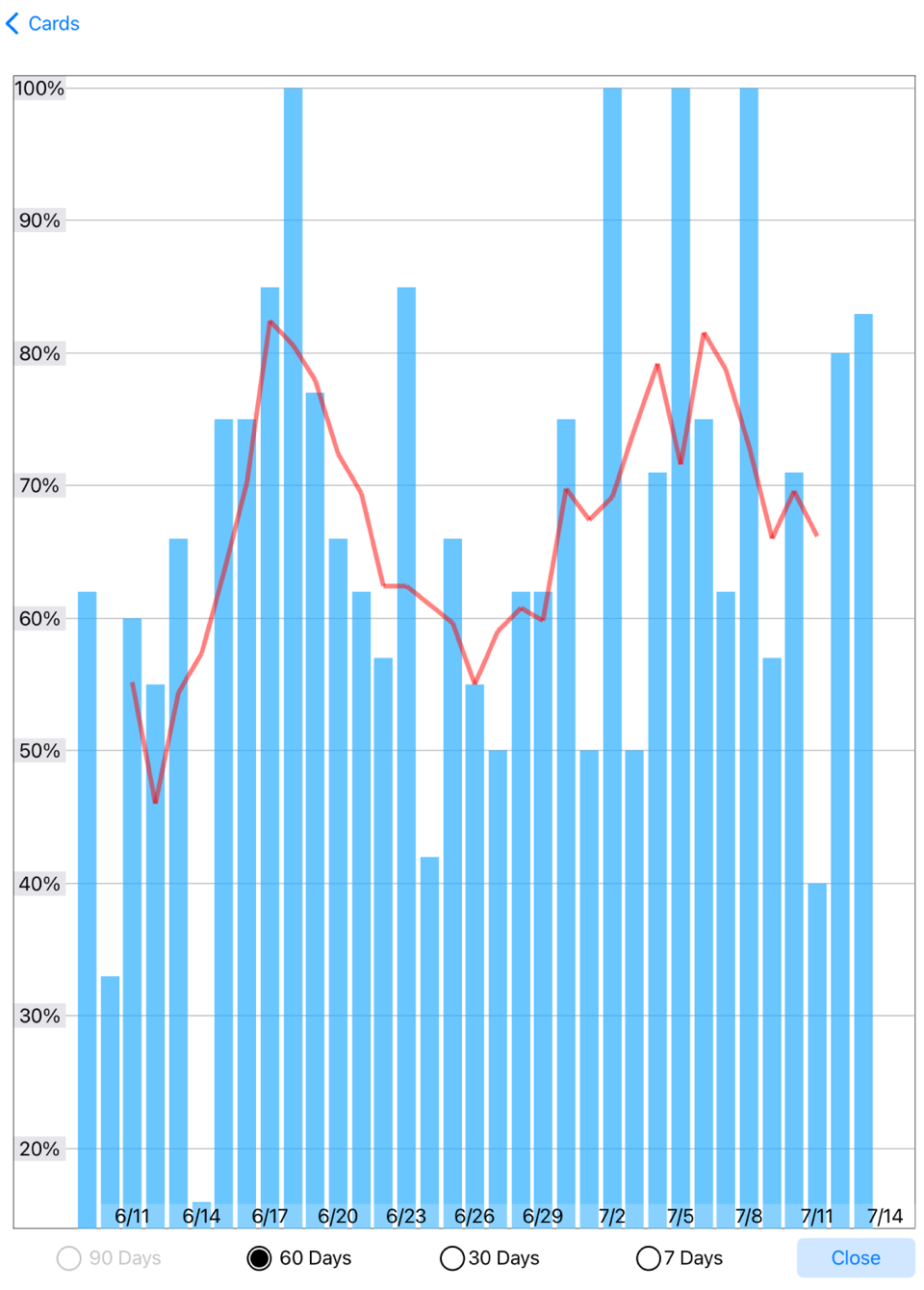 Tap the "Graph" button at the bottom of the Cards screen to display a bar chart, where each bar shows the percentage of questions answered correctly for that day. The red line shows a five day moving average, which provides a smoother curve. Depending on how far back your responses go, the 90 days, 60 days and 30 days buttons may be disabled.