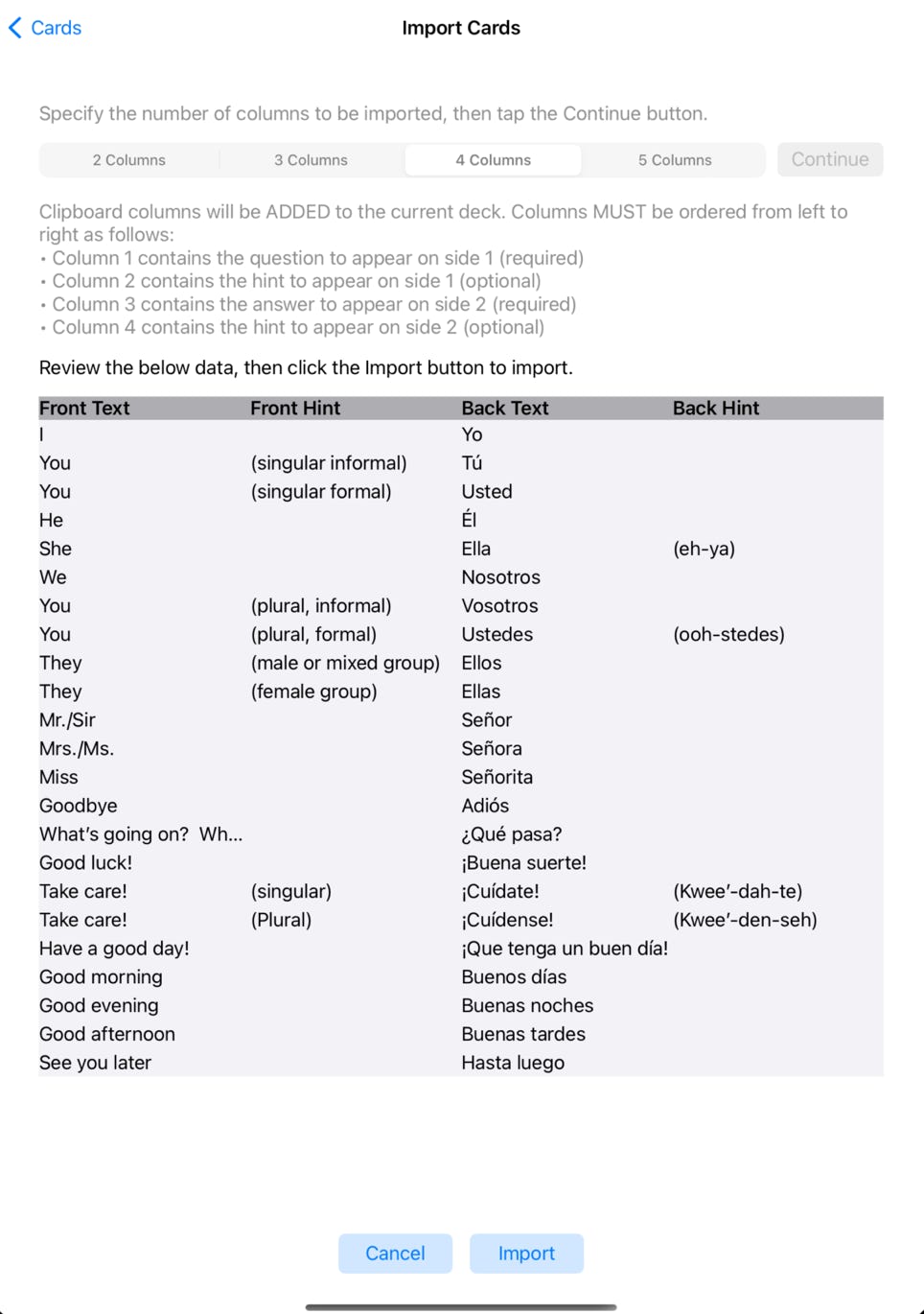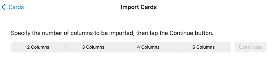 Note that “3 Columns” and “5 Columns” can only be used if you EXPORTED cards from this app, in which case column 1 will be the card identifier assigned by the app.