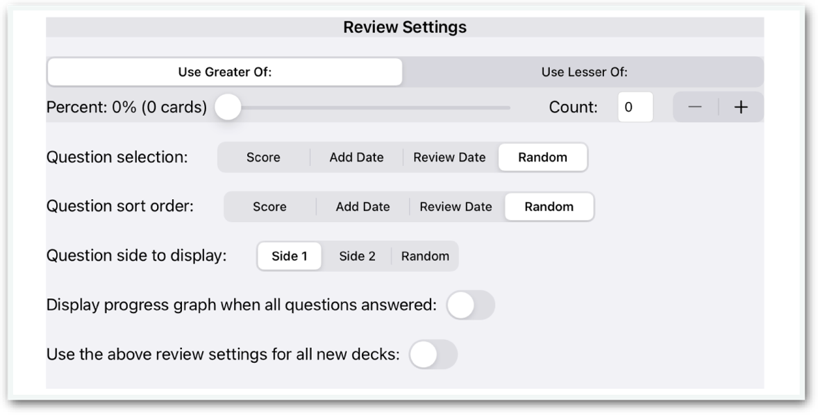This option lets you specify the minimum or maximum number of questions that are selected for a review session. This option is used in conjunction with the “Percent” and “Count” fields to determine how many cards are selected for a review session.