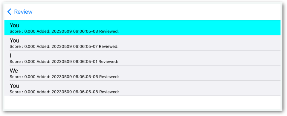 Tap the “Question List" button to see the complete set of questions for that session. The current question is highlighted in cyan.