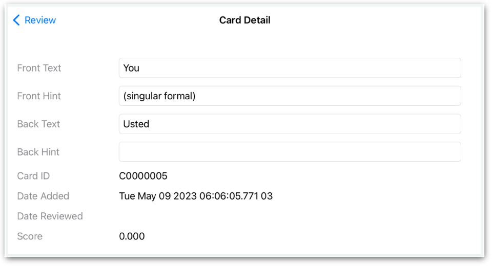 Tap the “Edit Card” button to display the Card Detail screen, where you can change the text or hints, e.g., if you notice a typo.