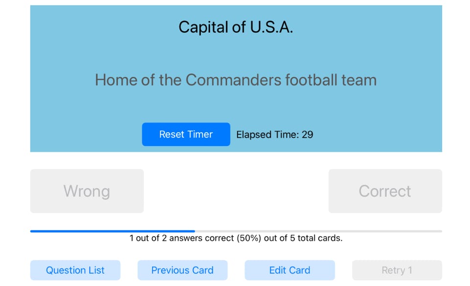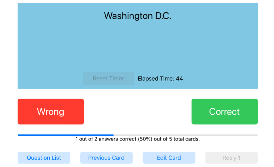 A timer in the blue area counts off the seconds it takes you to answer; the longer the time, the lower that question is scored. If you’re interrupted, tap the blue “Reset Timer” to reset the timer back to zero. The time also resets back to zero for each new question, or if you tap the Question List or Edit Card buttons.